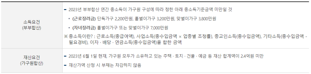 * 총소득기준금액 : 단독가구: 2,200만원, 홑벌이가구 : 3,200만원, 맞벌이가구 : 3,800만원 미만